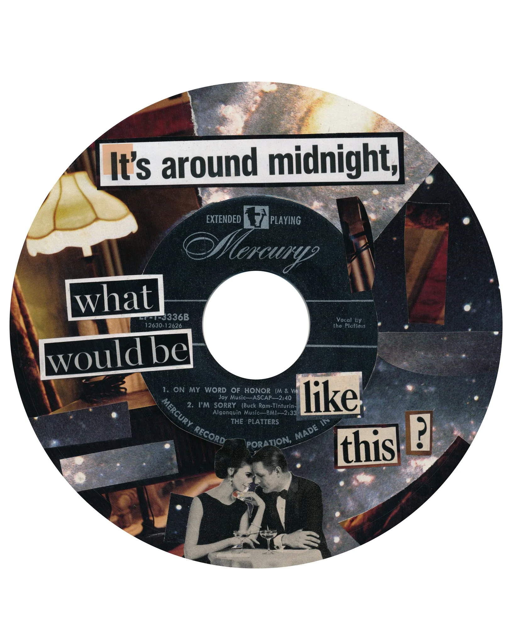 a hand cut and pasted collage on a 45 record, composed of images from vintage books and magazines; used under fair use principles.